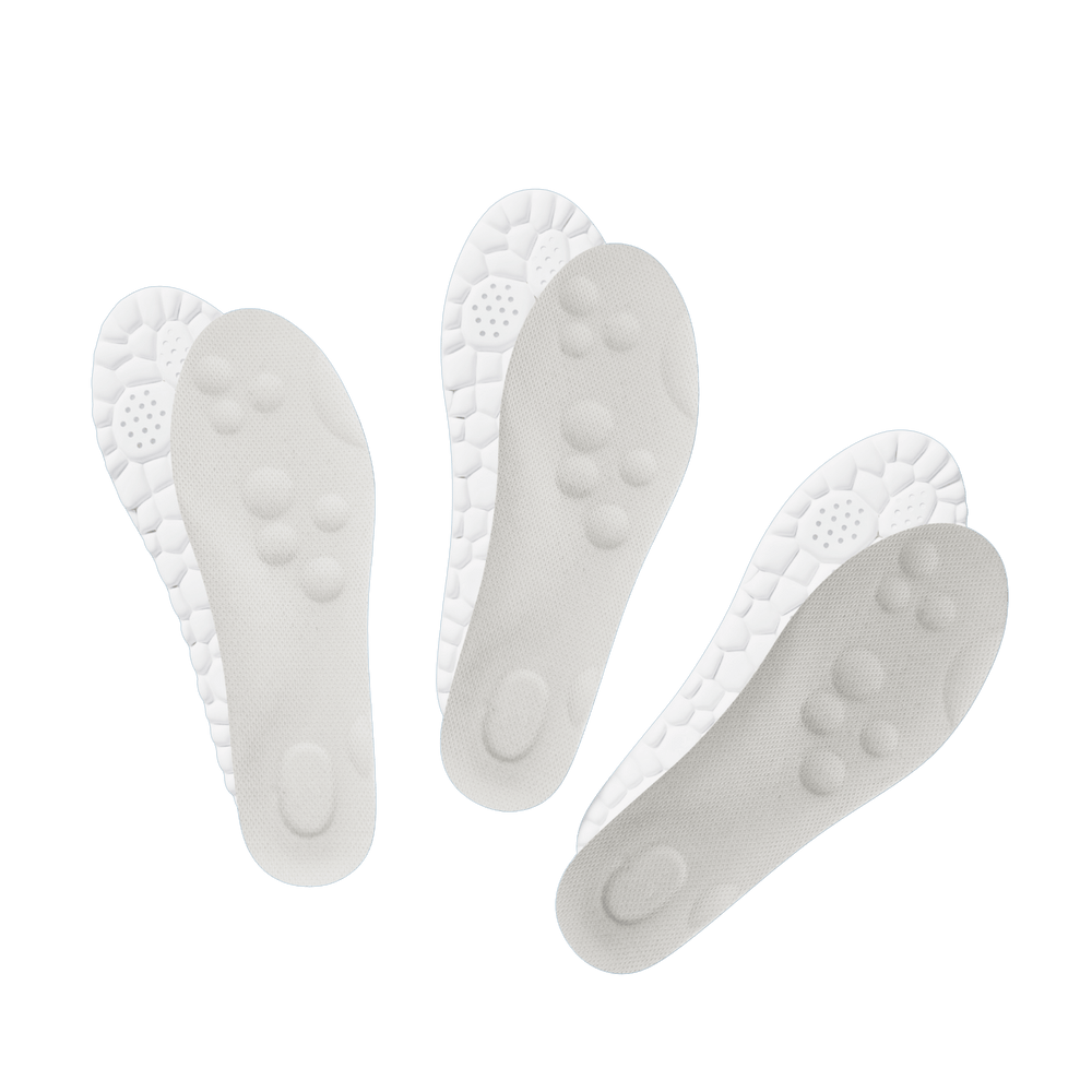 Softr insoles feature premium multi-density foam with massage nodes, moisture-wicking fabric top layer, and durable EVA base. Designed specifically for plantar fasciitis relief with materials that last 6-9 months of daily use.